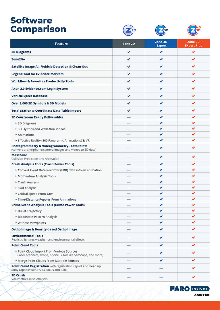 The software comparison chart below details the features associated with the Faro Zone 2025 suite.