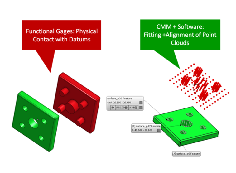 We have functional gauges “fitting” into parts. Datums and features are all physically defined, so the metrologist has a very physical contact with the entities he’s analyzing. At the same time, the physical gauges are vulnerable to wear and tear and must be regularly calibrated.